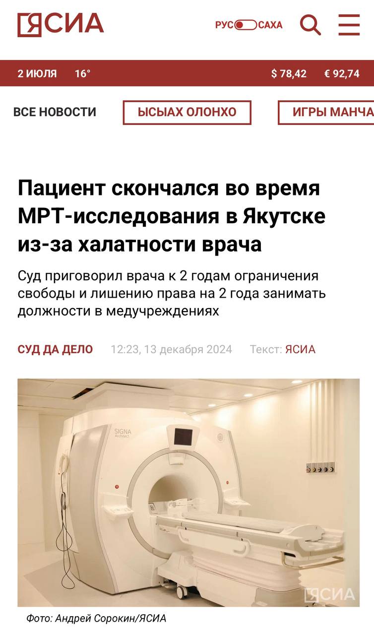 В декабре 2024 года госСМИ сообщили, что в Якутске из-за халатности врача скончался пациент во время МРТ-исследования в Якутске (направили на обследование с электрокардиостимулятором). Суд приговорил врача к 2 годам ограничения свободы и лишению права на 2 года занимать должности в медучреждениях.