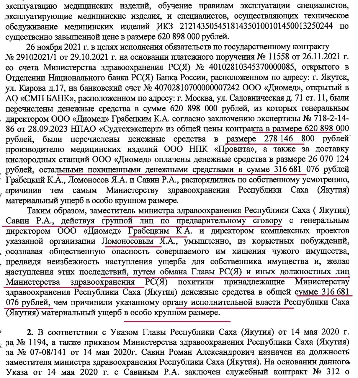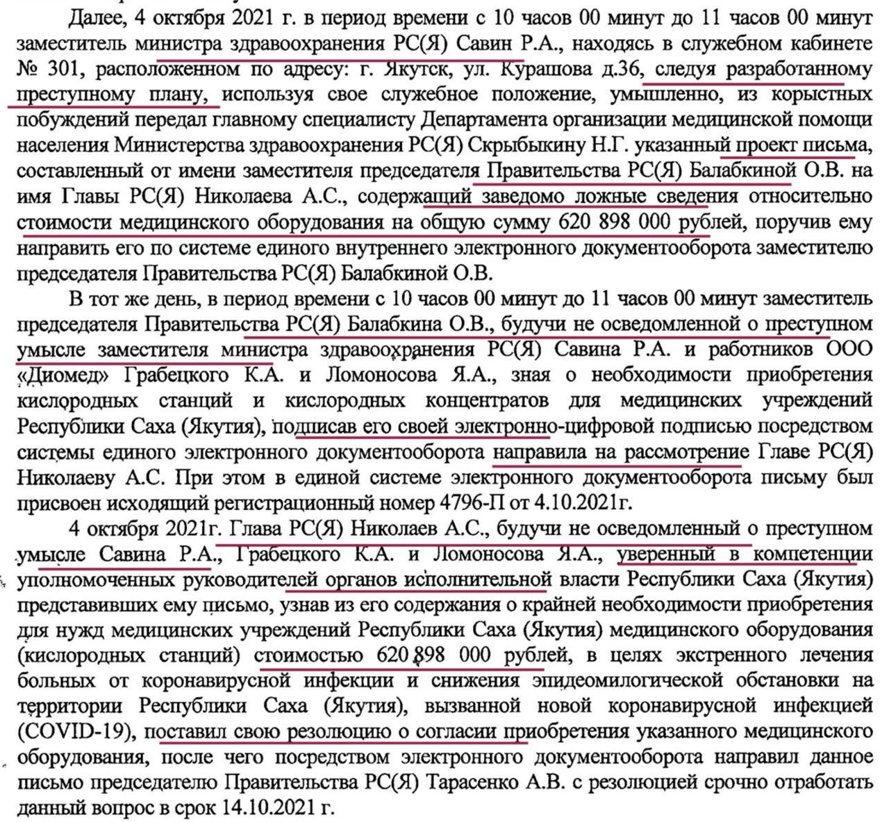 Так, в решении суда указано, что, по мнению следствия и прокуратуры, Ольга Балабкина и Айсен Николаев, будучи не осведомленными о преступных планах Савина и Грабецкого, подписали необходимые документы. В результате обмана главы Якутии и иных должностных лиц Минздрава РС(Я) было похищено 316,6 млн рублей.