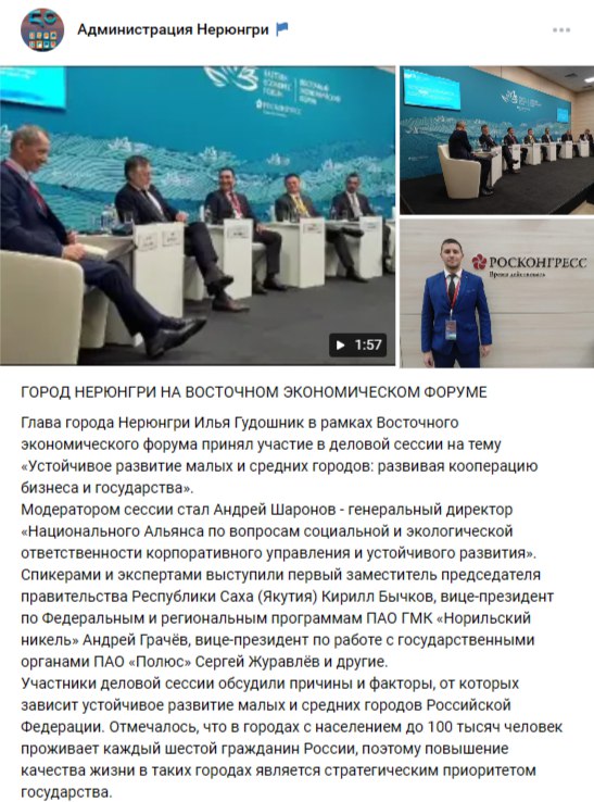 Но были и хвастливые публикации о посещениях всероссийских мероприятий: участие (или присутствие) вместе с директором УГХ Сергеем Лашовым во Втором Всероссийском форуме «Импортозамещение. Сделано в России» (Москва, сентябрь 2023 г) и участие (или присутствие) в работе Восточного экономического форума (Владивосток, сентябрь 2023 г).