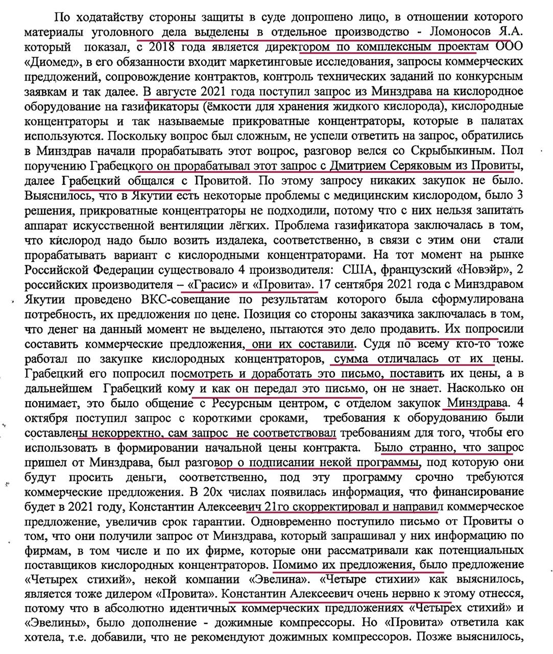 Допрошенный на следствии Ломоносов показал, что с августа 2021 года занимался вопросом поставки кислородных концентраторов по запросу Минздрава Якутии. По просьбе своего директора Грабецкого он несколько раз переделывал коммерческие предложения, которые отправляли в Якутию. В России на тот момент было два производителя – компании «Провита» и «Граси». Первая компания «Провита» также получала запрос от Минздрава Якутии по кислородным концентраторам и он, Ломоносов, как представитель компании-посредника общался с этим производителем.
