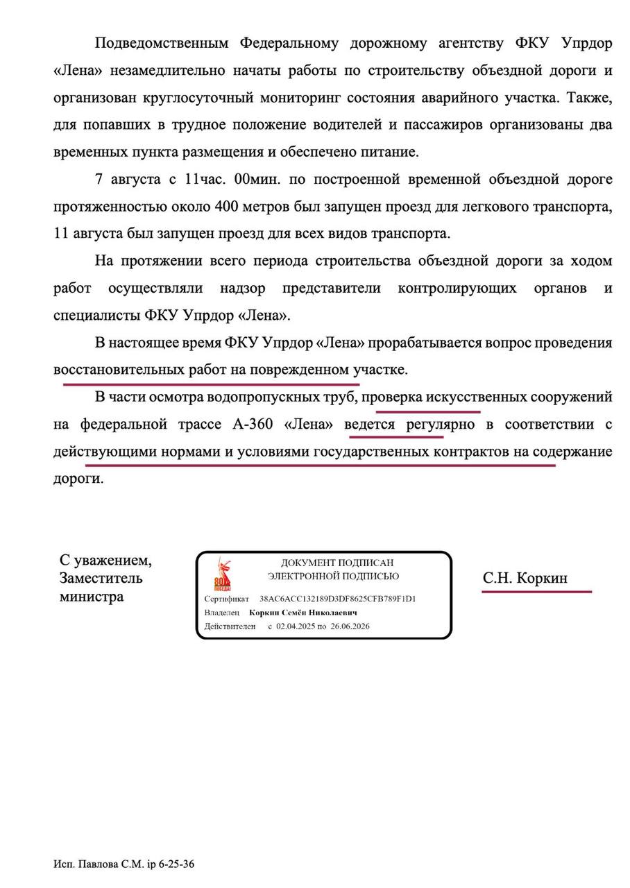 При этом, замминистра Коркин заранее в своем ответе оправдал ФКУ Упрдор «Лена», указав, что «осмотр водопропускных труб, проверка искусственных сооружений