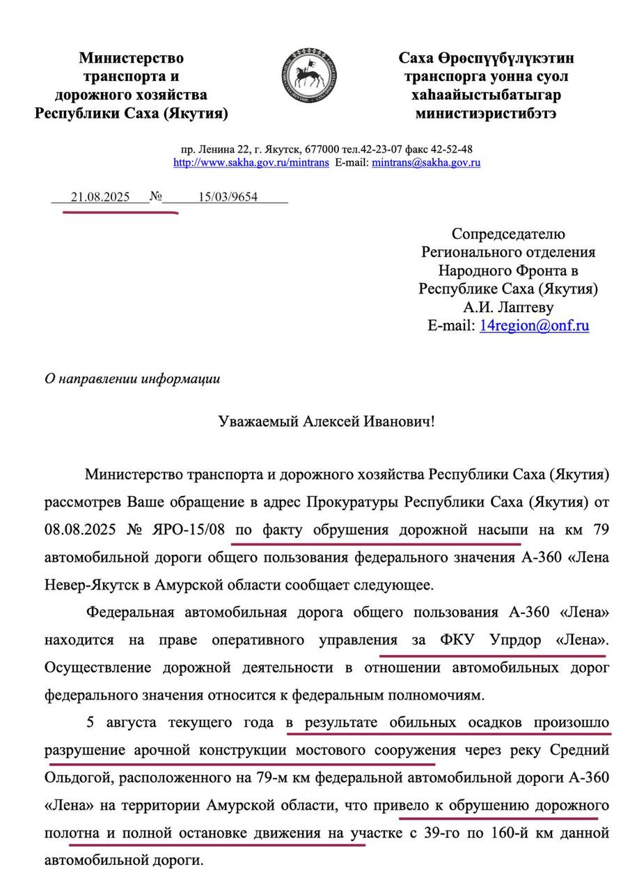 После того, как 5 августа на участке федеральной трассы А-360 «Лена» произошел обвал дорожного полотна, что привело к парализации движения авто, сопредседатель Народного фронта в Якутии Алексей Лаптев направил запрос в Минтранс Якутии, чтобы выяснить каковы истинные причины данной аварии, учитывая, что за содержание этой дороги отвечает хоть и федеральное учреждение ФКУ Упрдор «Лена» (Бубнов Алексей), но расположенное в Алданском районе Якутии.