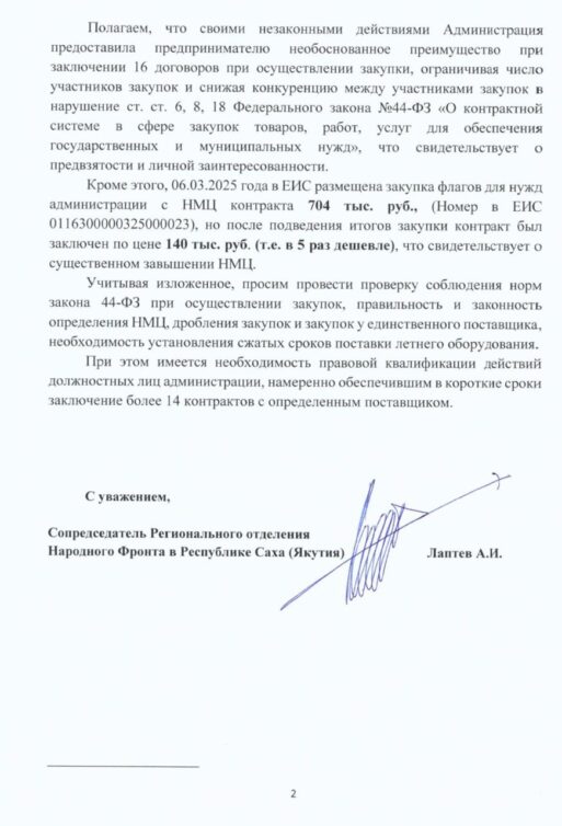 Они ставят вопросы по особенностям закупки спортивных тренажёров администрацией города Нерюнгри в декабре 2024 года. Обращают внимание, что были разбиты лоты, хотя фактически это была одна закупка спортивных тренажеров. Спортивные тренажёры были оплачены администрацией города Нерюнгри, то есть это бюджетные средства.