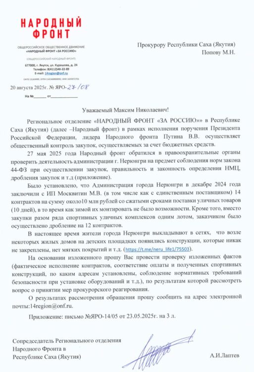 В связи с этим Народный фронт в РС(Я) обращается к прокурору Якутии с просьбой, проверить как законность этих контрактов, так и их исполнение, учитывая, что речь идет о миллионах бюджетных средств.
