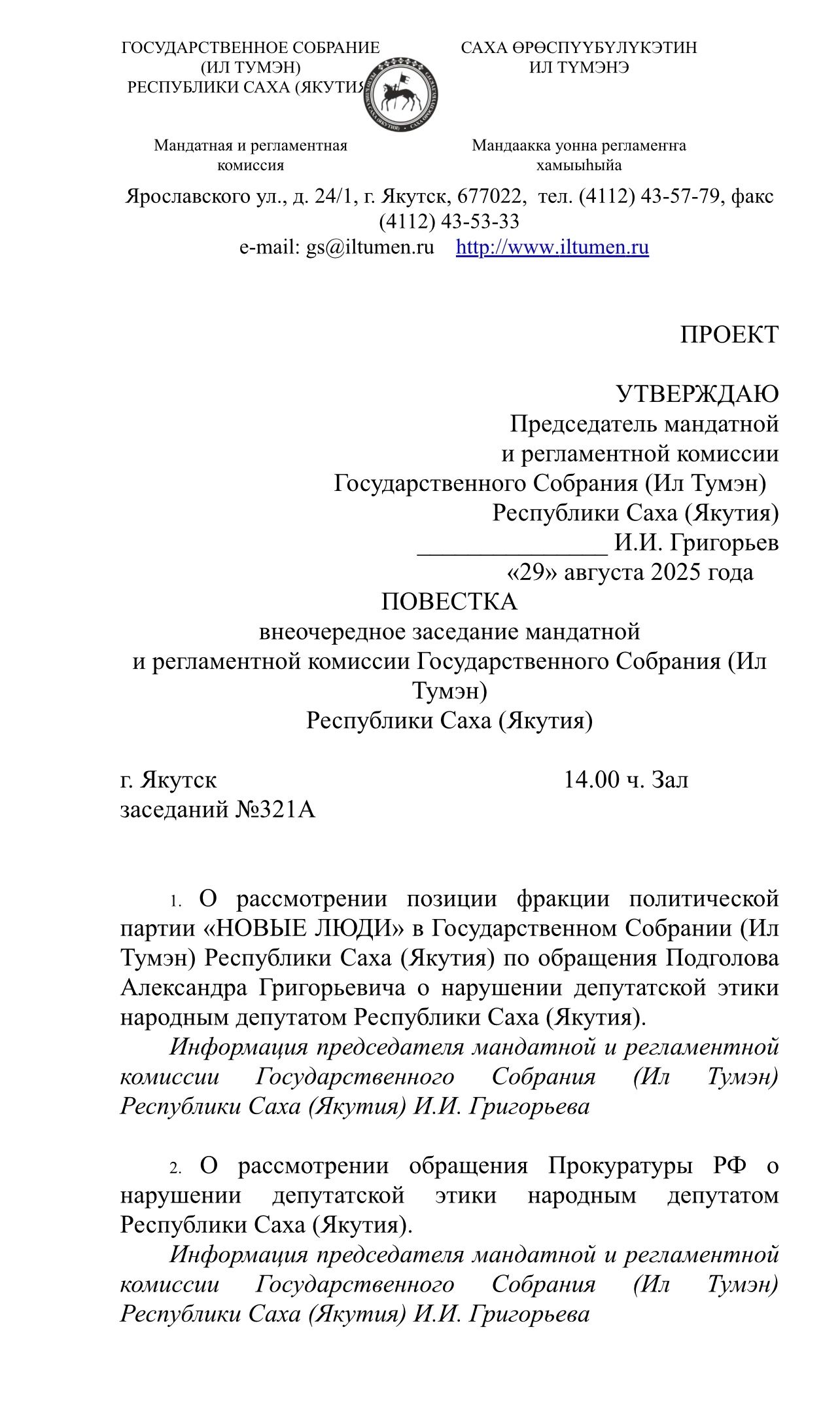 Кстати, по нему поступила небезынтересная информация. Оказывается, на внеочередном заседании Мандатной и регламентной комиссии Ил Тумэн, возглавляемой эсером Игорем Григорьевым, где 29 августа рассматривались вопросы по новолюду Иванову, не было ни самого Иванова, ни представителей фракции "Новые люди", ни самой прокуратуры, которая направила по нему свое обращение в парламент, ни Подголова, также внесшего по его душу свое обращение в Госсобрание.