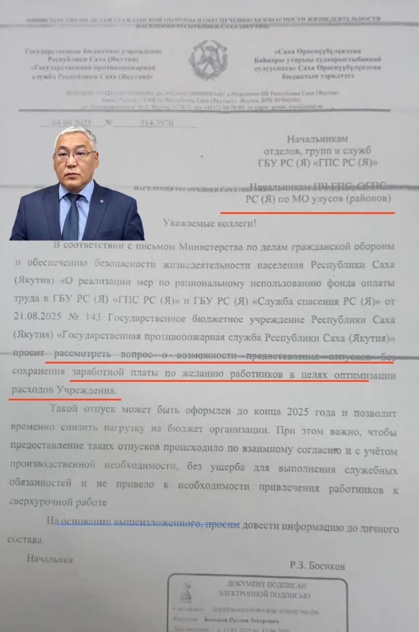 Данное предложение сотрудникам было направлено на основании письма Министерства по делам гражданской обороны и обеспечению безопасности жизнедеятельности населения РС(Я) (Лепчиков Дмитрий) «О реализации мер по рациональному использованию фонда оплаты труда), судя по которому аналогичное предложение получили работники ГБУ «Служба спасения РС(Я)».