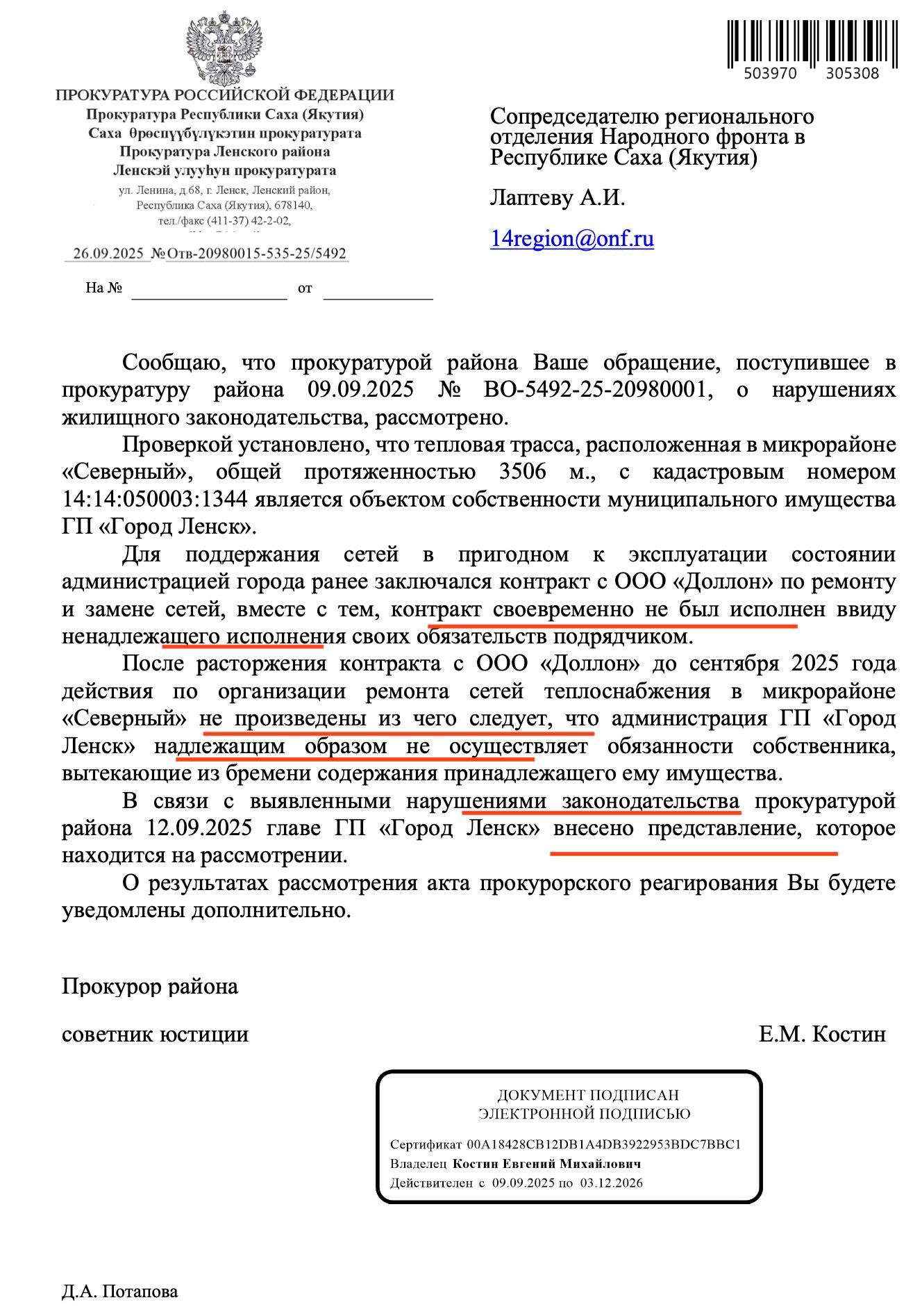 Народный фронт РС(Я) в лице Лаптева Алексея попросил прокуратуру провести проверку по этим фактам, которая установила, что в мкр Северный протяженность теплотрасс составляет 3 506 м., которые находятся в муниципальной собственности.