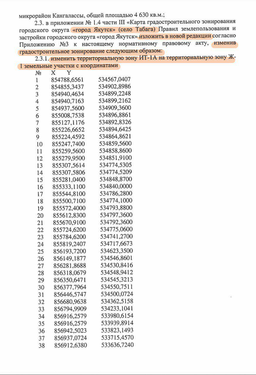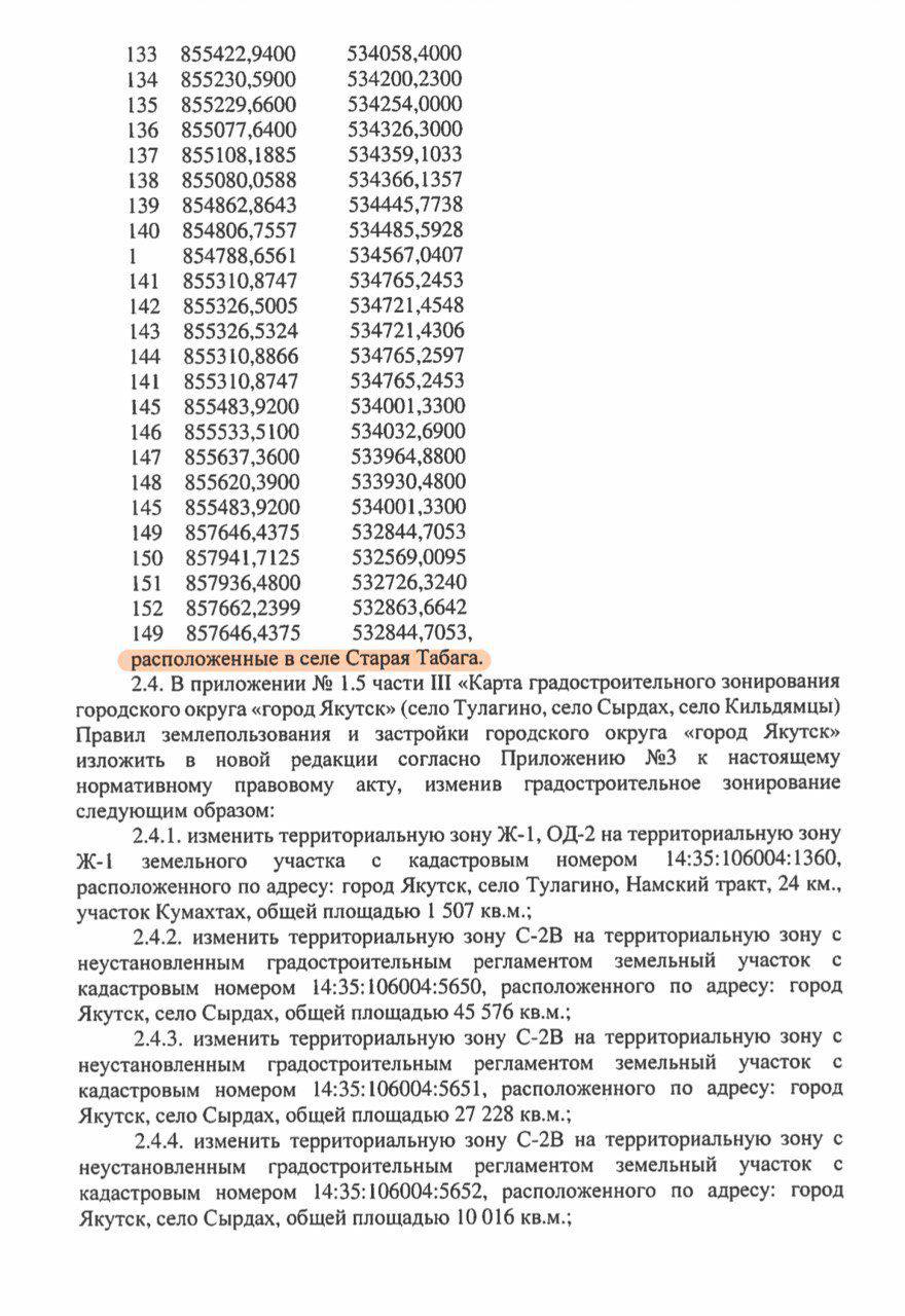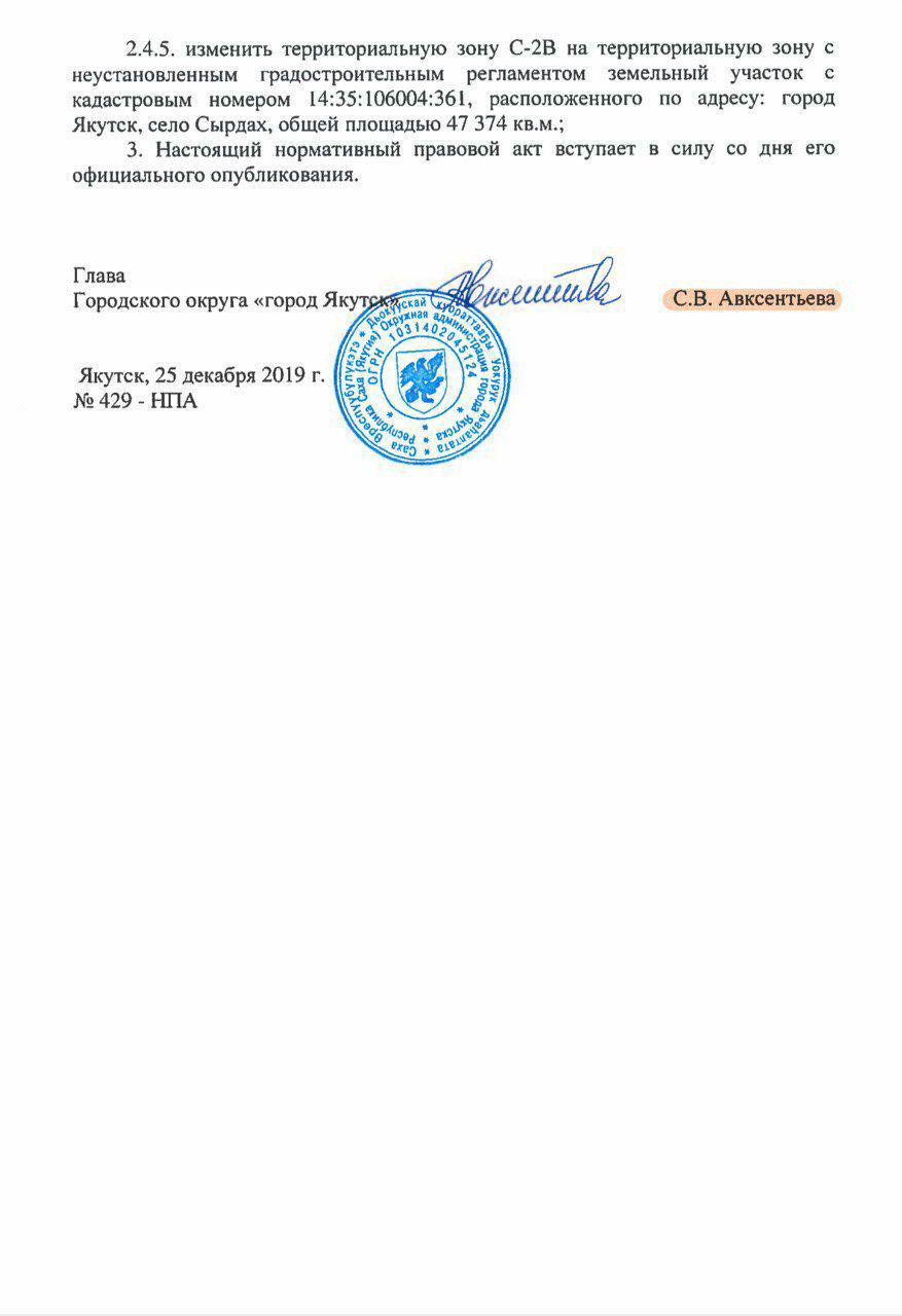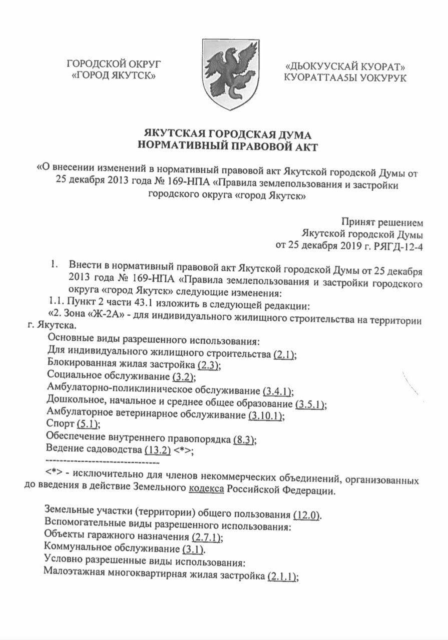 В редакцию ЯСИА отправили скан-копию нормативного правового акта Якутской гордумы от 25 декабря 2019 года, подписанную главой Якутска Сарданой Авксентьевой. Мы изучили многостраничный документ, в конце которого указано об изменении Правил землепользования и застройки табагинских участков.