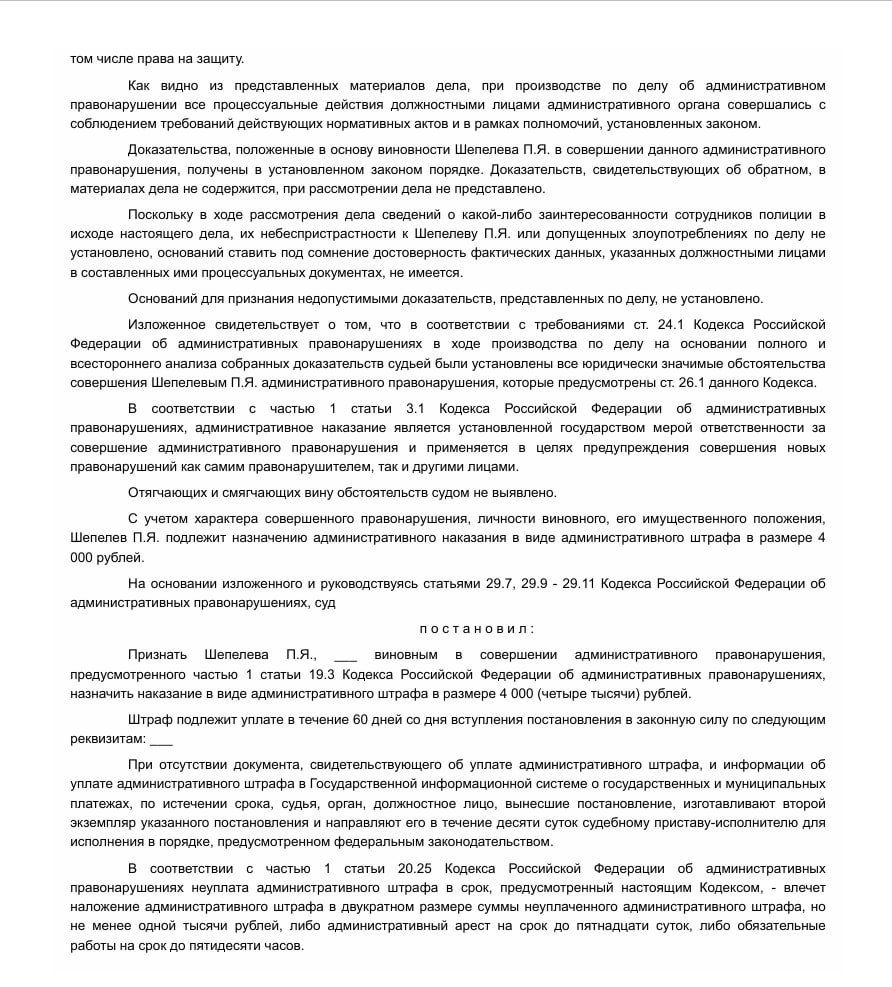 Два штрафа по 4000 рублей за неповиновение полиции.