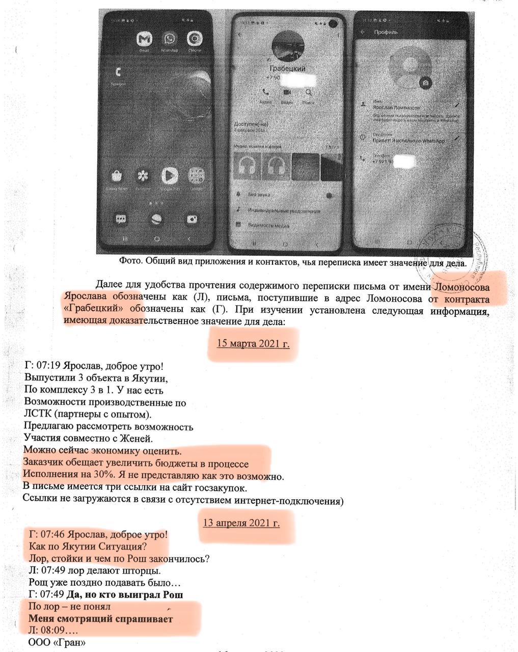 Более того, после проведения одного из тендеров в медучреждении Якутии, Грабецкий 13 апреля 2021 года спрашивает у Ломоносова, кто его выиграл, так как последний отвечал за это. При этом Грабецкий сообщает Ломоносову, что этим вопросом интересуется «смотрящий», после чего Ломоносов называет имя победителя.
