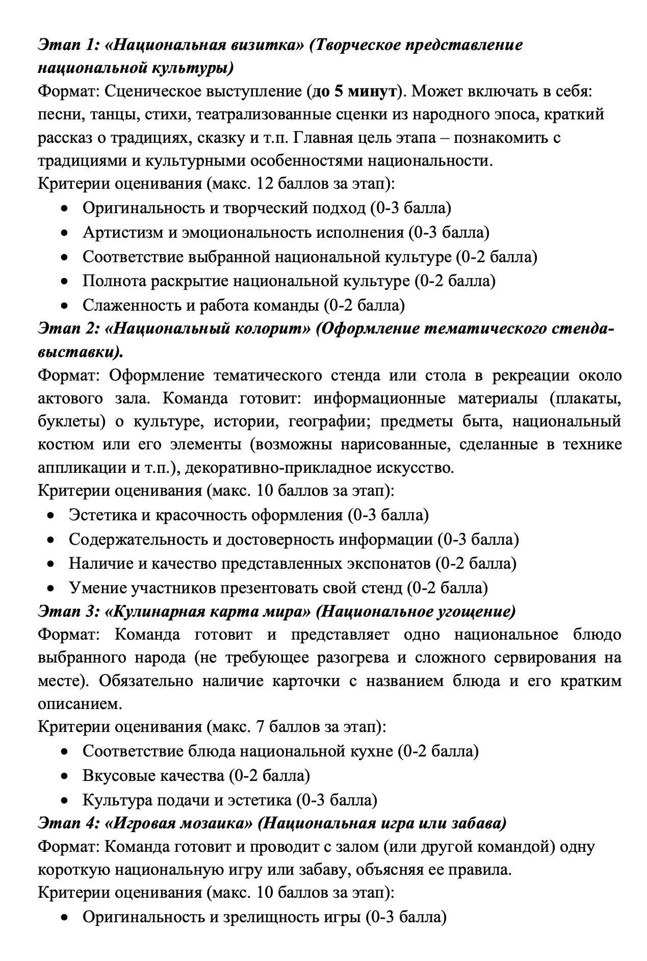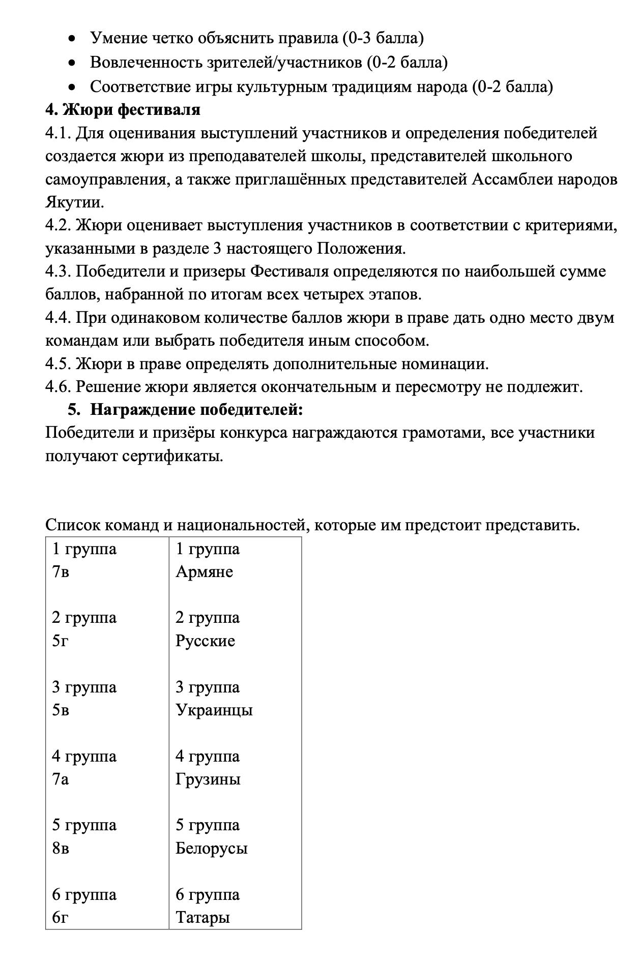 В игре примут участие обучающиеся 5-8 классов, которые выберут голосованием, какую национальность они будут представлять (список таких национальностей утвержден руководством школы: армяне, русские, украинцы, якуты и др.), а затем будут соревноваться по темам: национальная культура, колорит, кулинария, игра.
