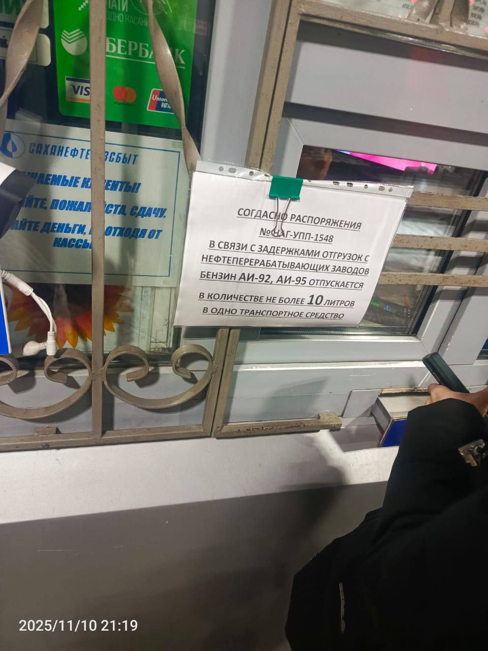 Осенью 2025 года были зафиксированы рекордные простои в работе нефтеперерабатывающих заводов, вплоть до 38% от всех мощностей, что привело к дефициту бензинового топлива. По этой причине, отгрузки нефтепродуктов с нефтеперерабатывающих заводов идут с большими задержками, что создаёт дефицит топлива на прирельсовых нефтебазах АО "Саханефтегазсбыт".