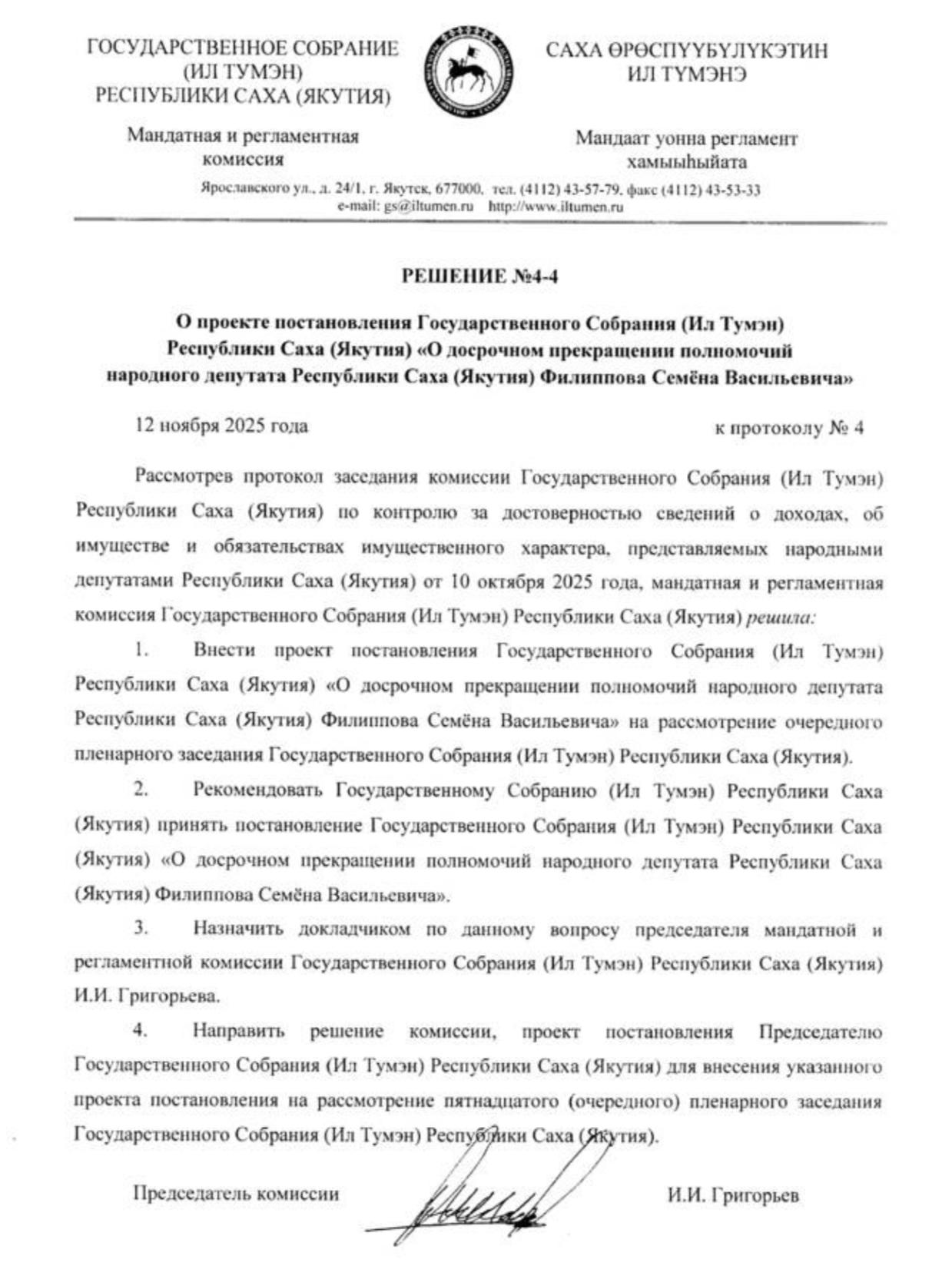 Депутата Ил Тумэна, член фракции политической партии "Коммунистическая партия РФ" Филиппова Семена досрочно лишат депутатских полномочий, но не из-за уголовного дела о взятках, а за непредоставление за 2024 год сведений о сделках, общая сумма которых превышает его доход и его супруги за последние три года.