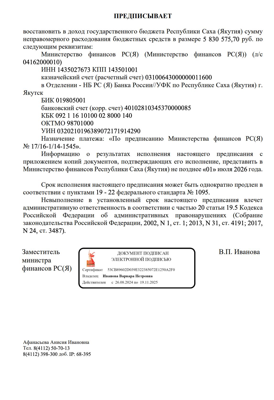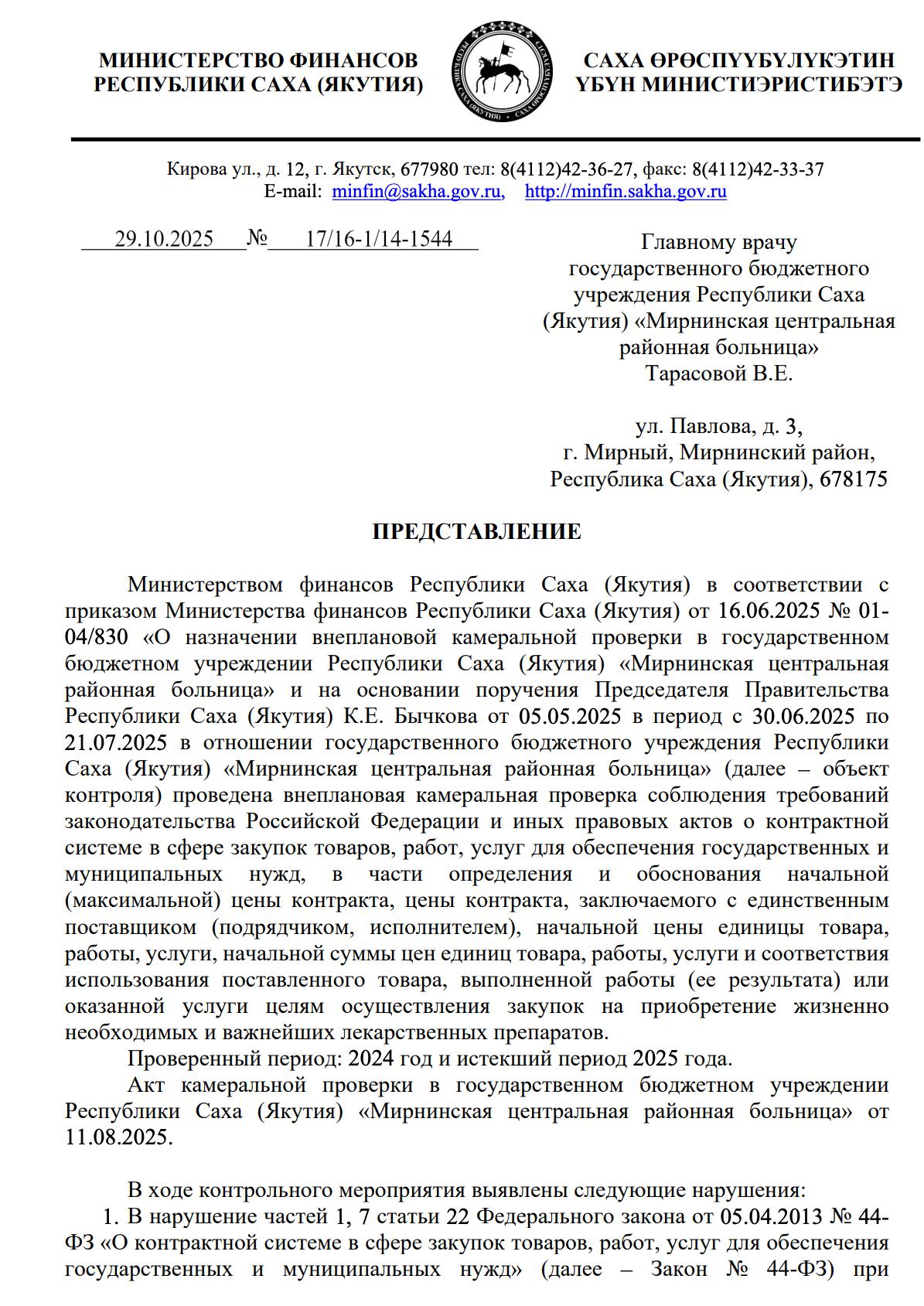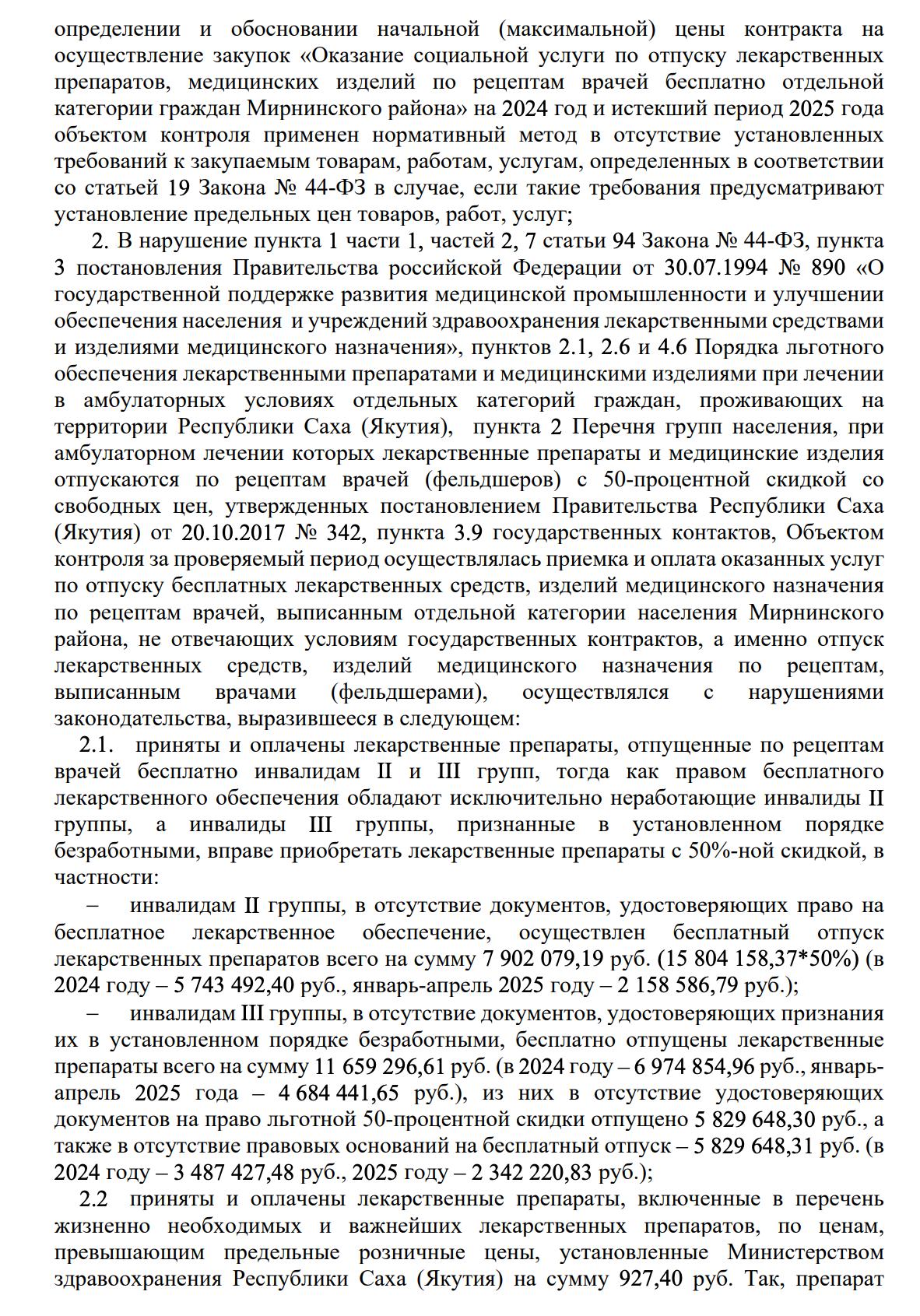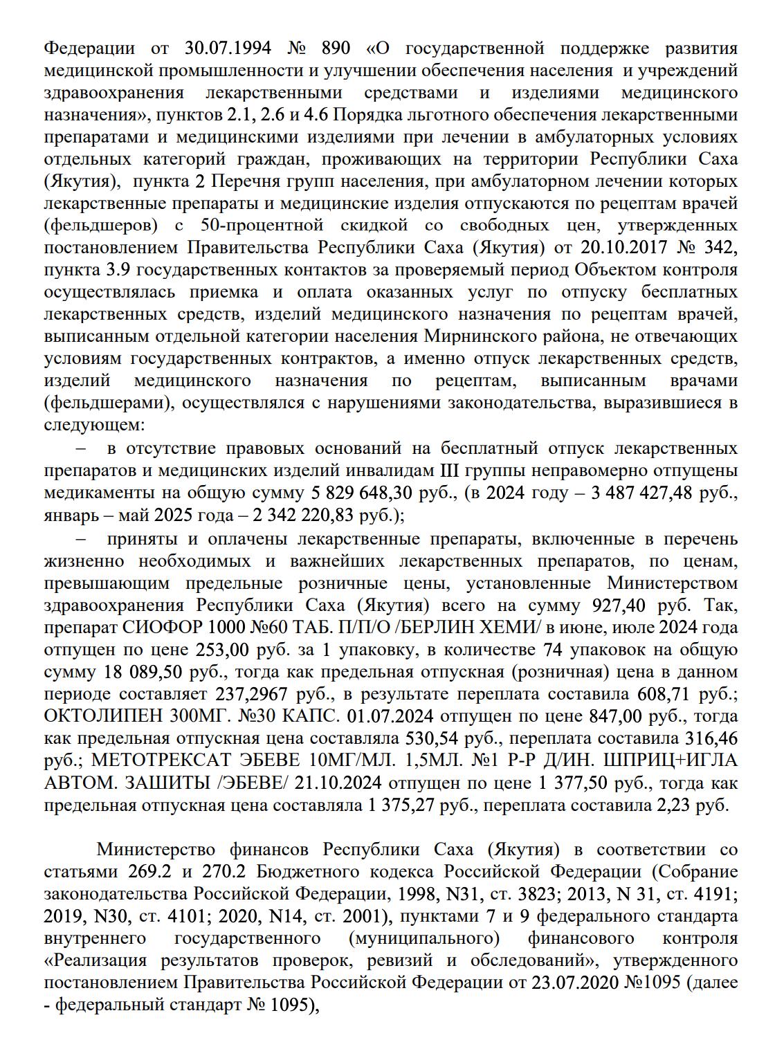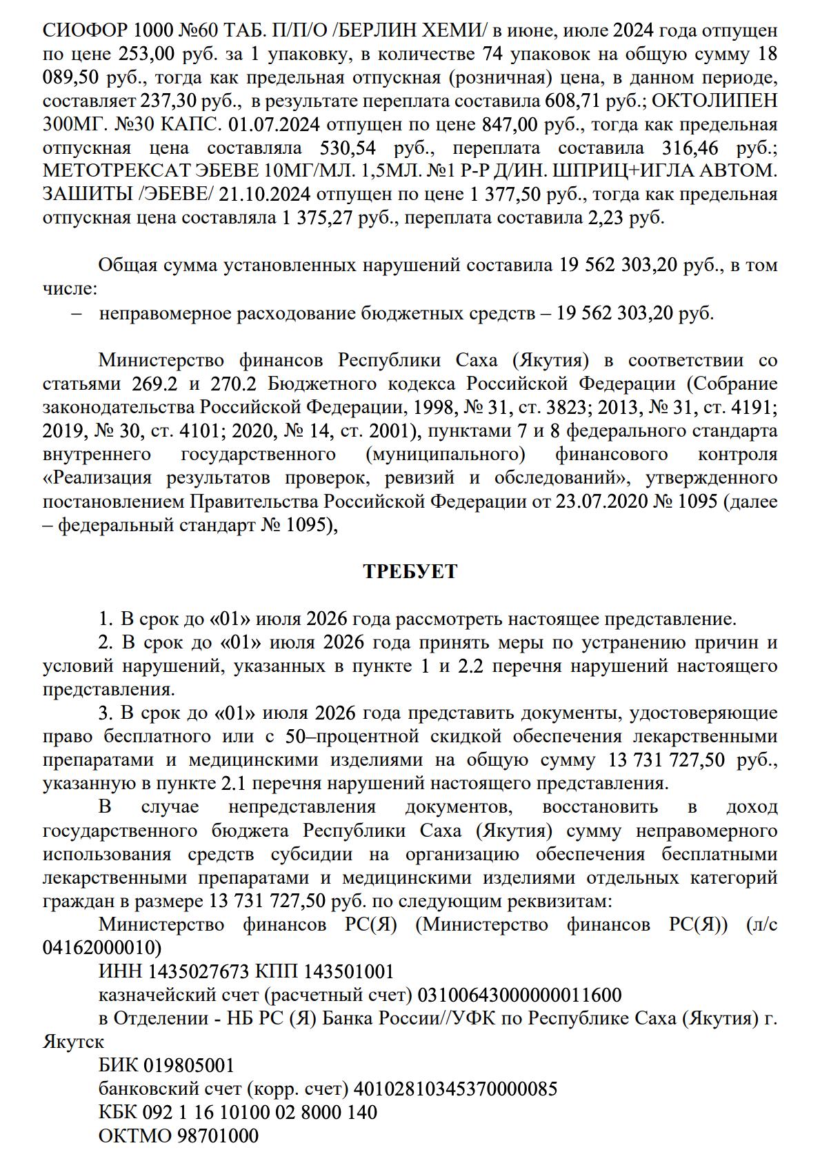 Требования Минфина (представления от 29 октября): Немедленно вернуть 5,83 млн руб. в бюджет, так как в отсутствие правовых оснований на бесплатный отпуск лекарственных препаратов и медицинских изделий инвалидам III группы в 2024-2025 годах неправомерно были отпущены медикаменты на общую сумму 5 829 648,30 руб.