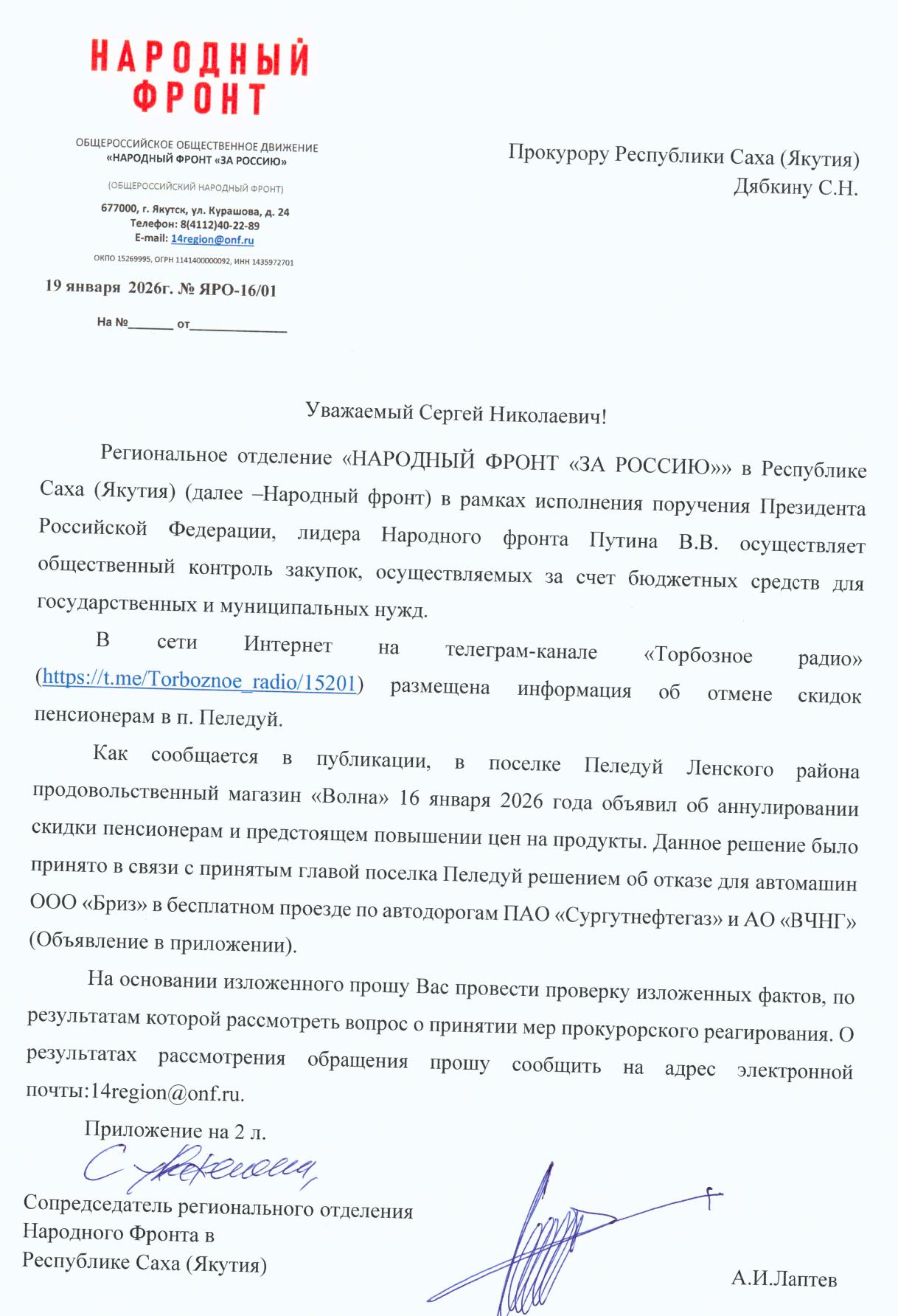 Сопредседатель регионального отделения Народного фронта в РС(Я) Лаптев Алексей просит прокурора Якутии Дябкина Сергея провести проверку в отношении главы поселка Пеледуй Ленского района Кирсанова после публикации статьи.