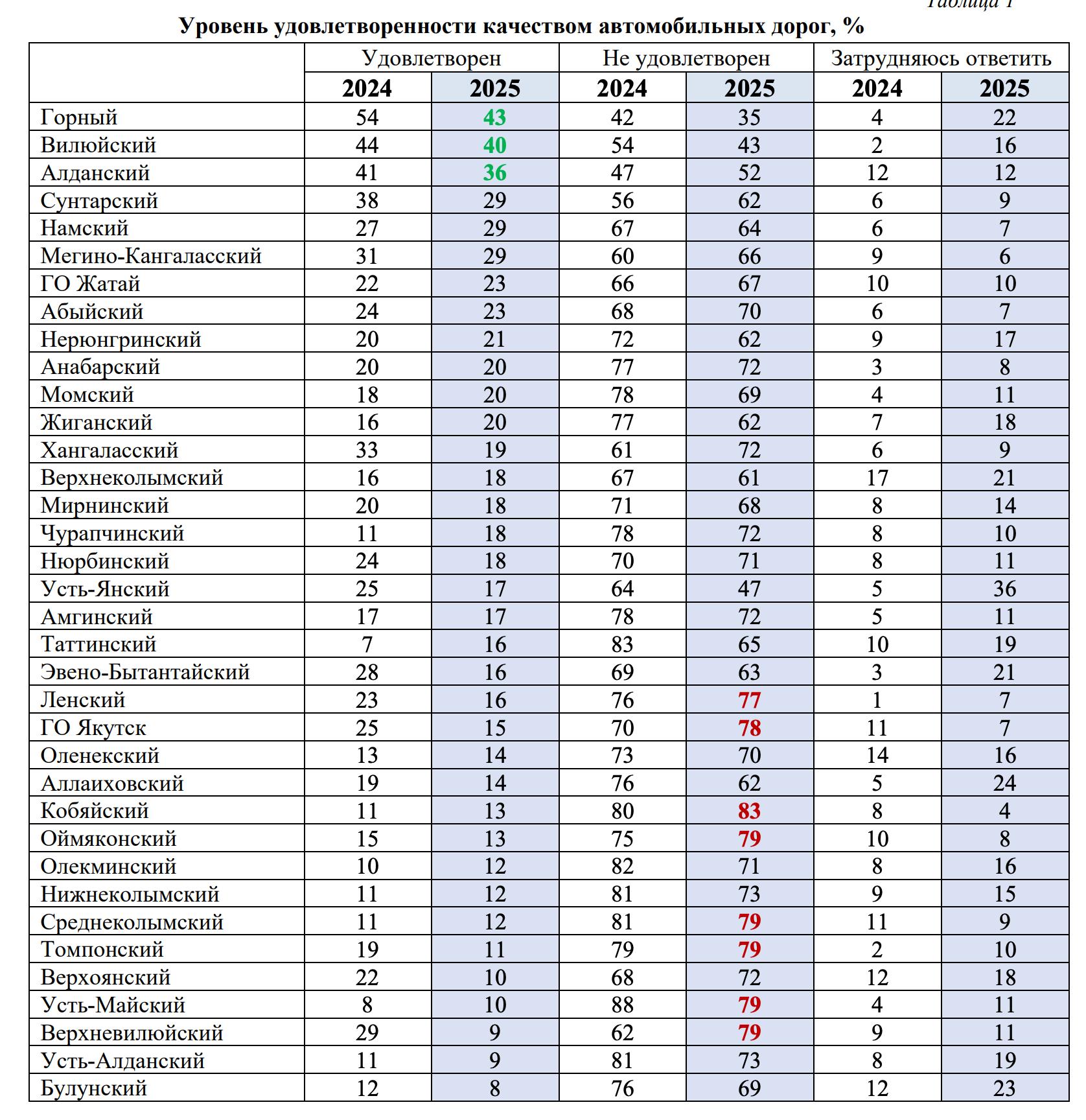Тем не менее, в Горном районе сохраняется самый высокий уровень удовлетворенности (43%). За ним следуют Вилюйский (40%) и Алданский (36%) районы.