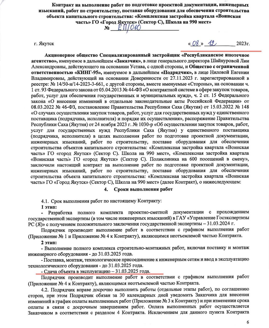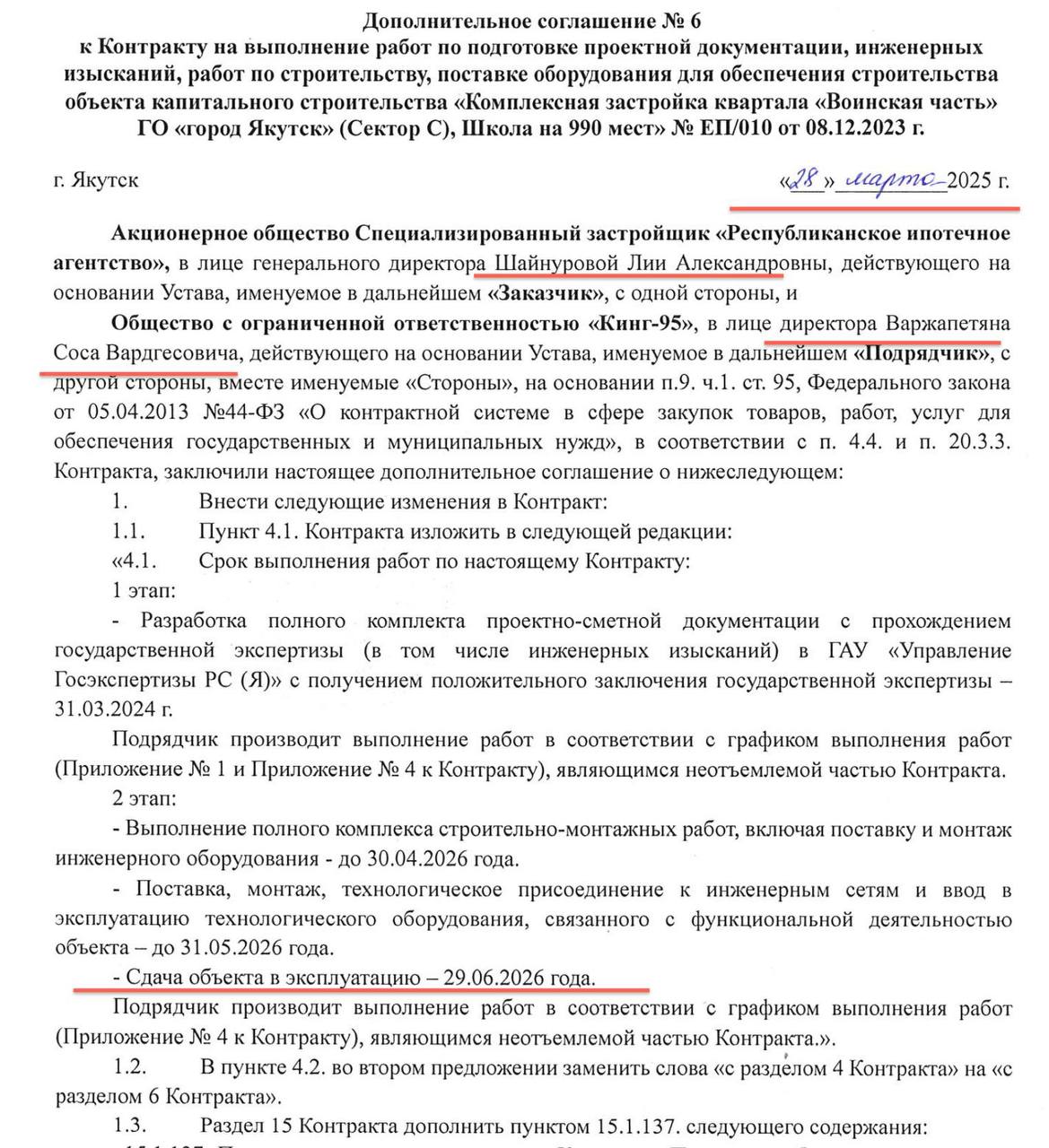 ✔️28 марта 2025 года Шайнурова и Варжапетян подписали дополнительное соглашение к контракту, которым определили, что срок сдачи школы в эксплуатацию переносится на 29 июня 2026 года.