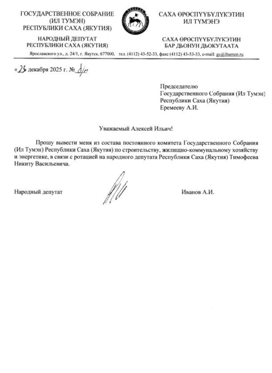 Депутат Иванов Александр попросил спикера Ил Тумэна Еремеева вывести его из состава Комитета по строительству, ЖКХ и энергетики, заменив его на депутата из фракции «Новые люди» Тимофеева Никиту.