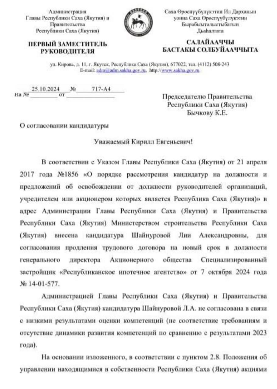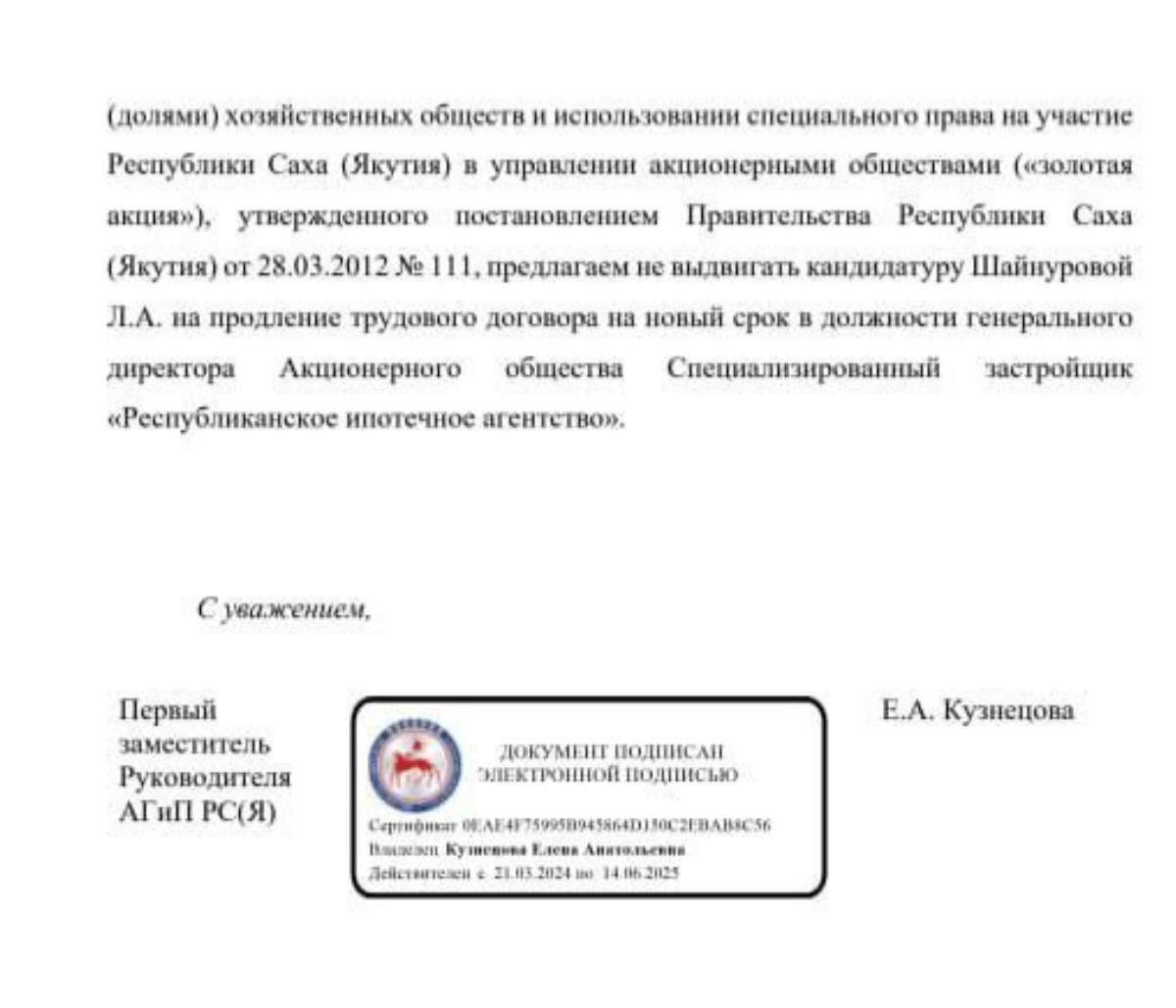 Первый заместитель руководителя Администрации главы и правительства Якутии Кузнецова Елена выступила против продления трудового договора с Шайнуровой Лией на новый срок в должности генерального директора АО Специализированный застройщик «Республиканское ипотечное агентство», которое отвечает за строительство жилья и инфраструктуры для переселения из аварийного жилья, осваивая десятки миллиардов рублей минуя госзакупки: конкурсы и аукционы.