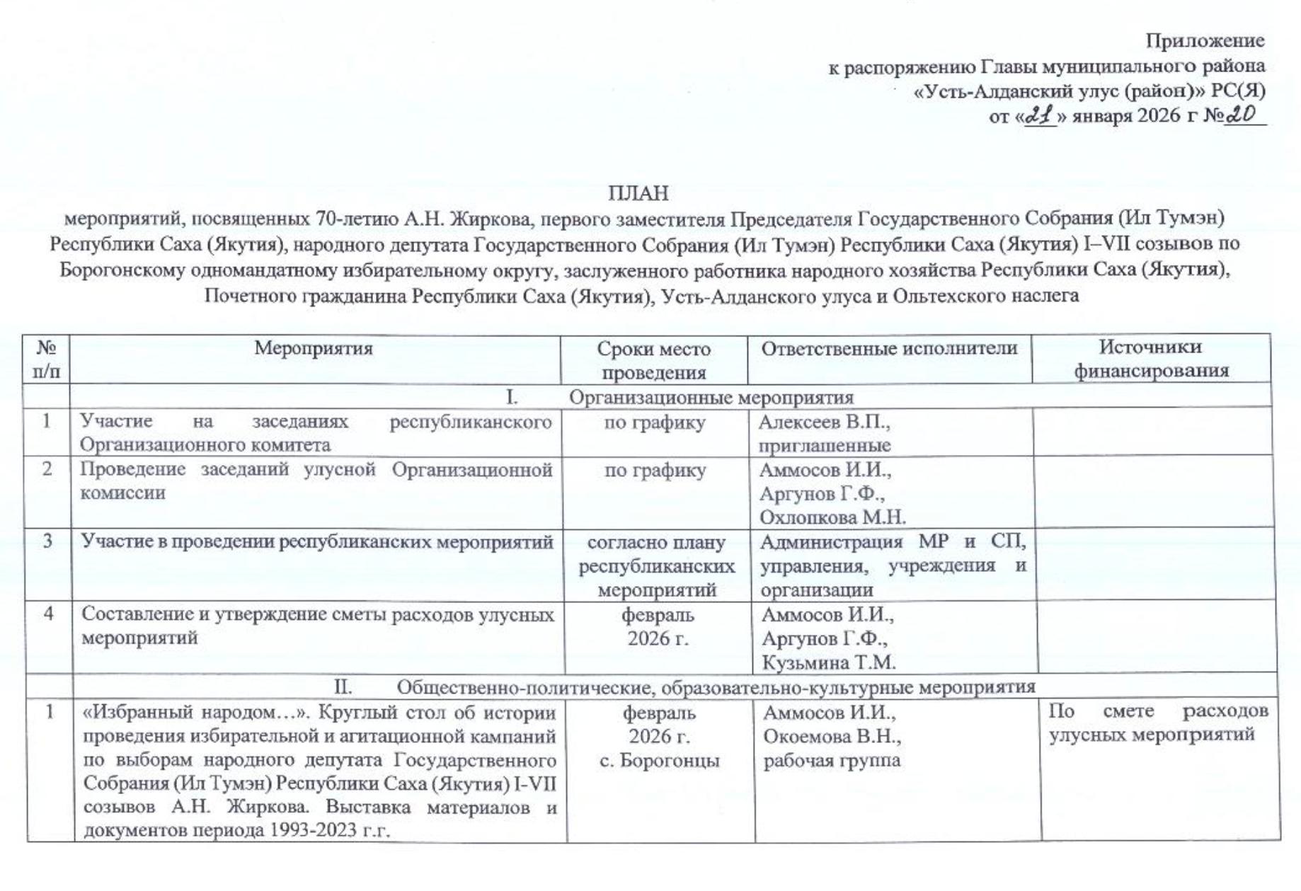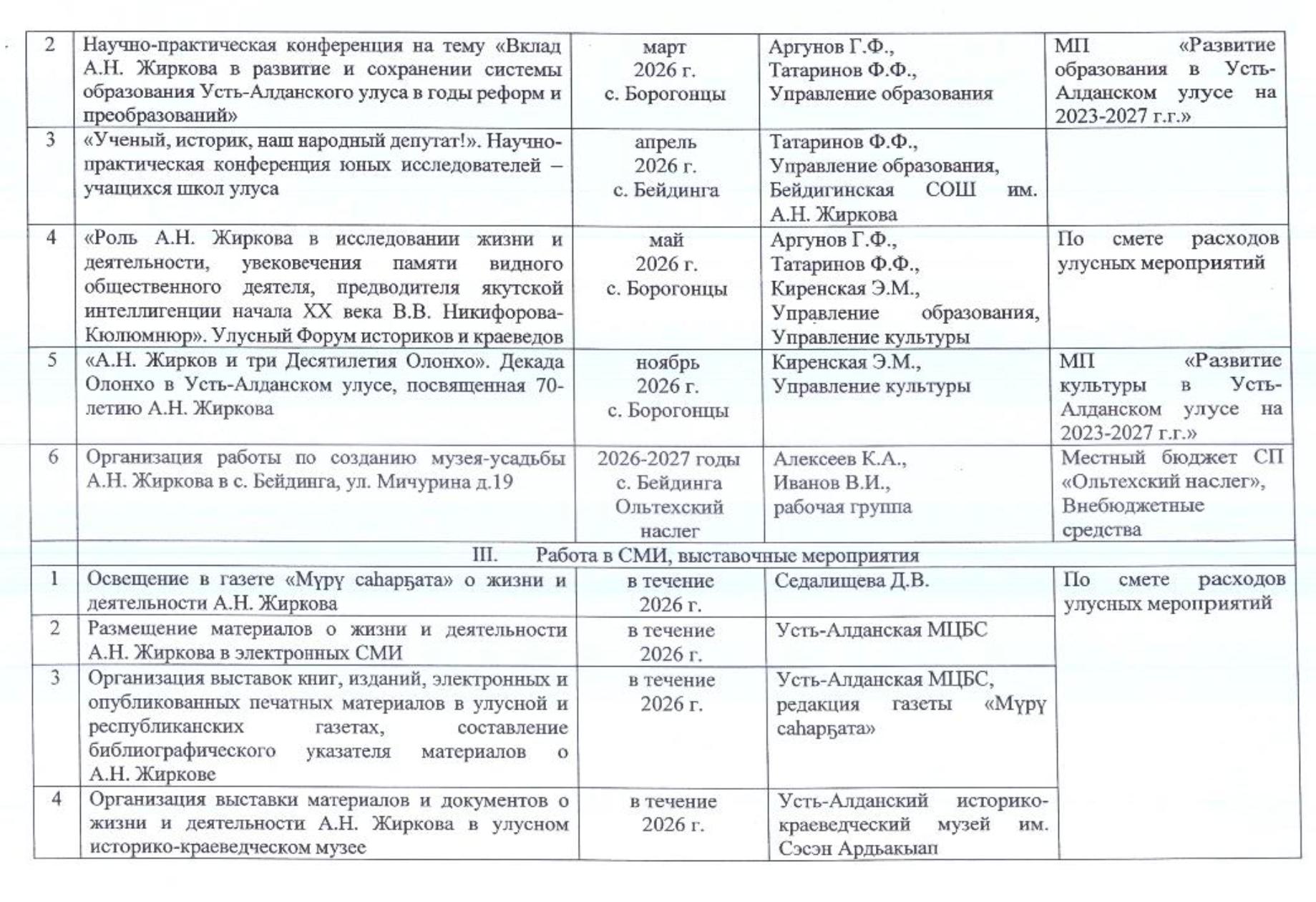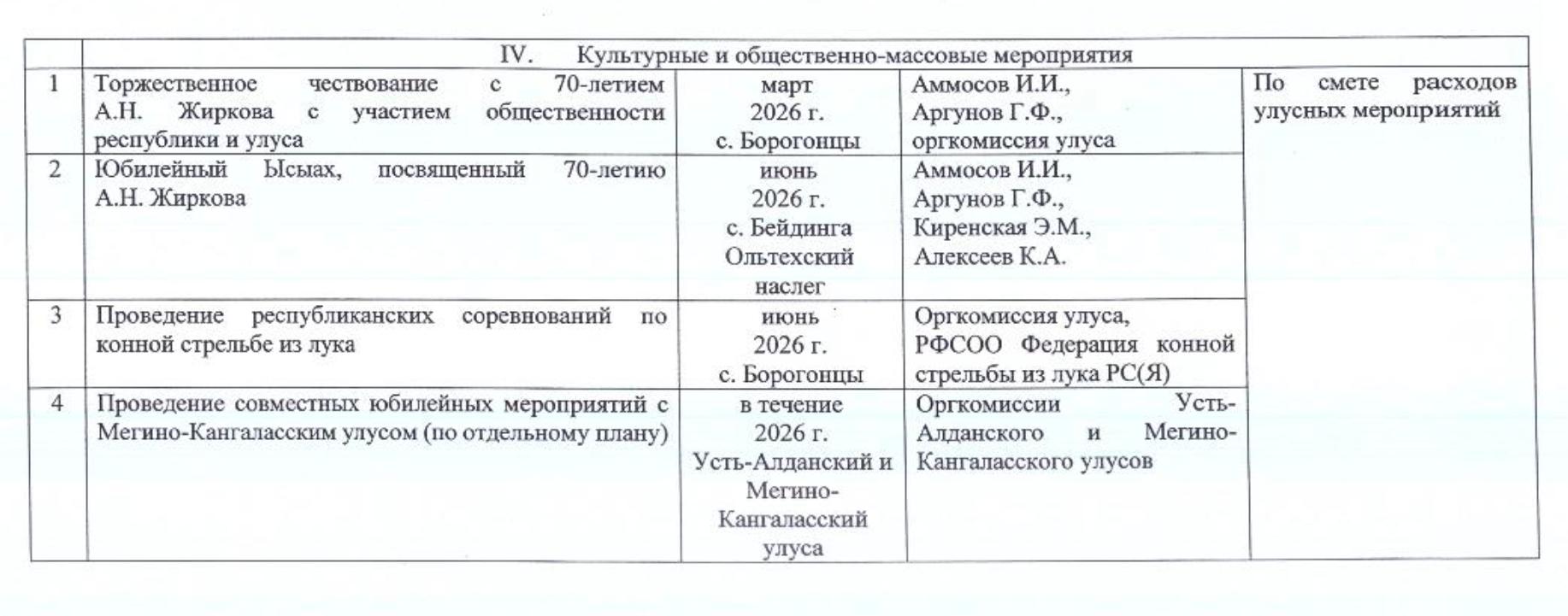 Согласно утвержденному Плану празднования юбилея, для этого из муниципального и сельских бюджетов будут выделены бюджетные средства, а также неизвестная сумма будет предусмотрена для поездок на республиканские праздничные мероприятия указанной выше делегации улусных чиновников.