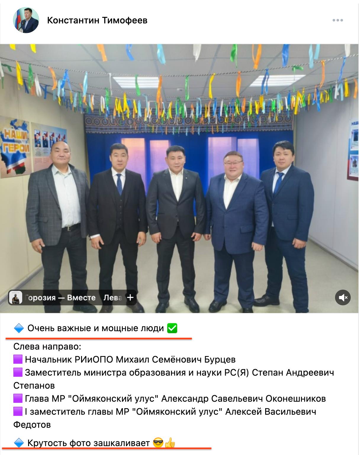 Начальник Управления образования администрации Оймяконского улуса Константин Тимофеев считает, что на фото "Очень важные и мощные люди", а "Крутость фото зашкаливает".