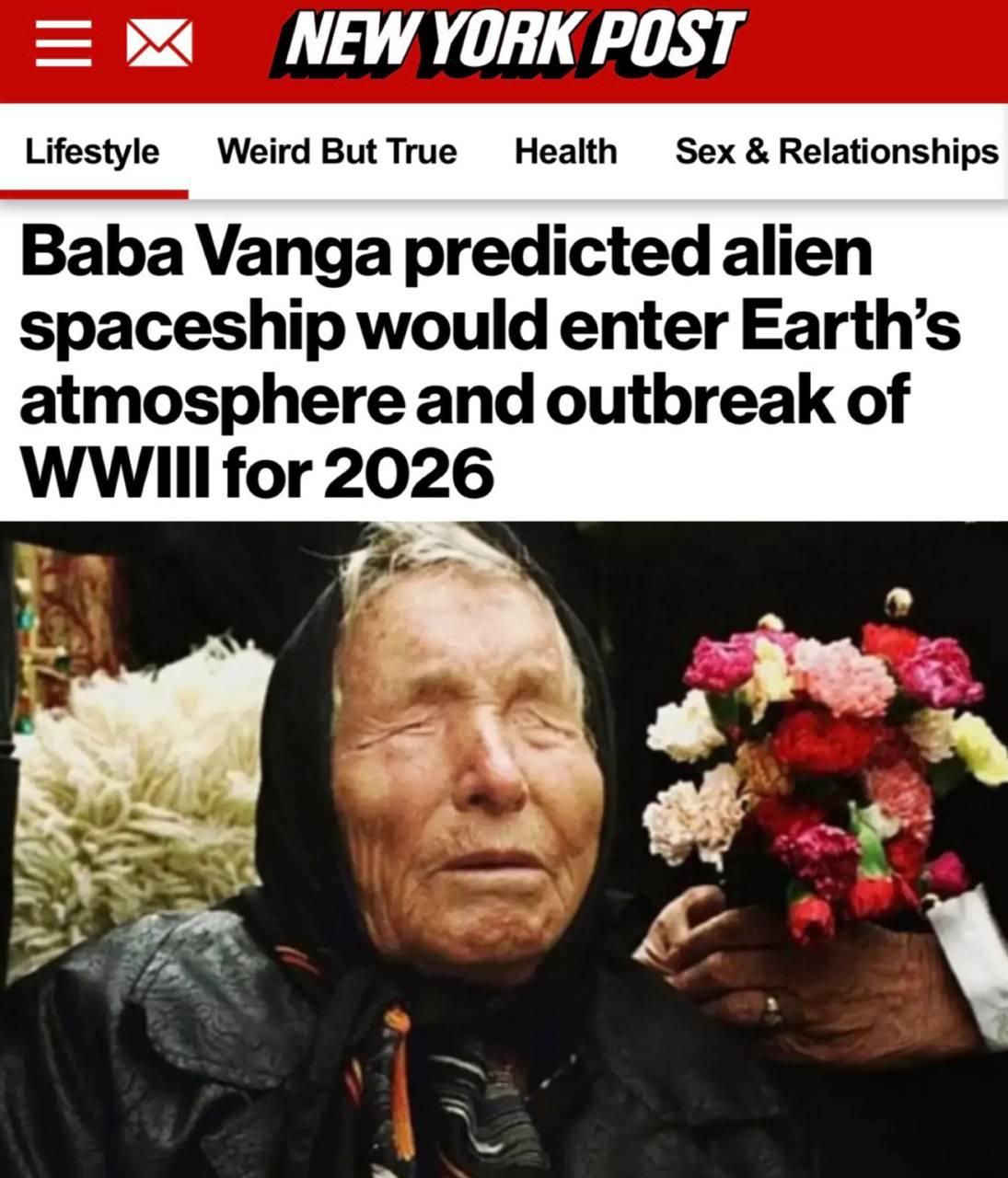 Одно из самых заметных предсказаний Ванги — столкновение человечества с другой цивилизацией в ноябре 2026 года, когда в атмосферу Земли войдет гигантский космический корабль, и начнется новая эпоха в истории человечества.