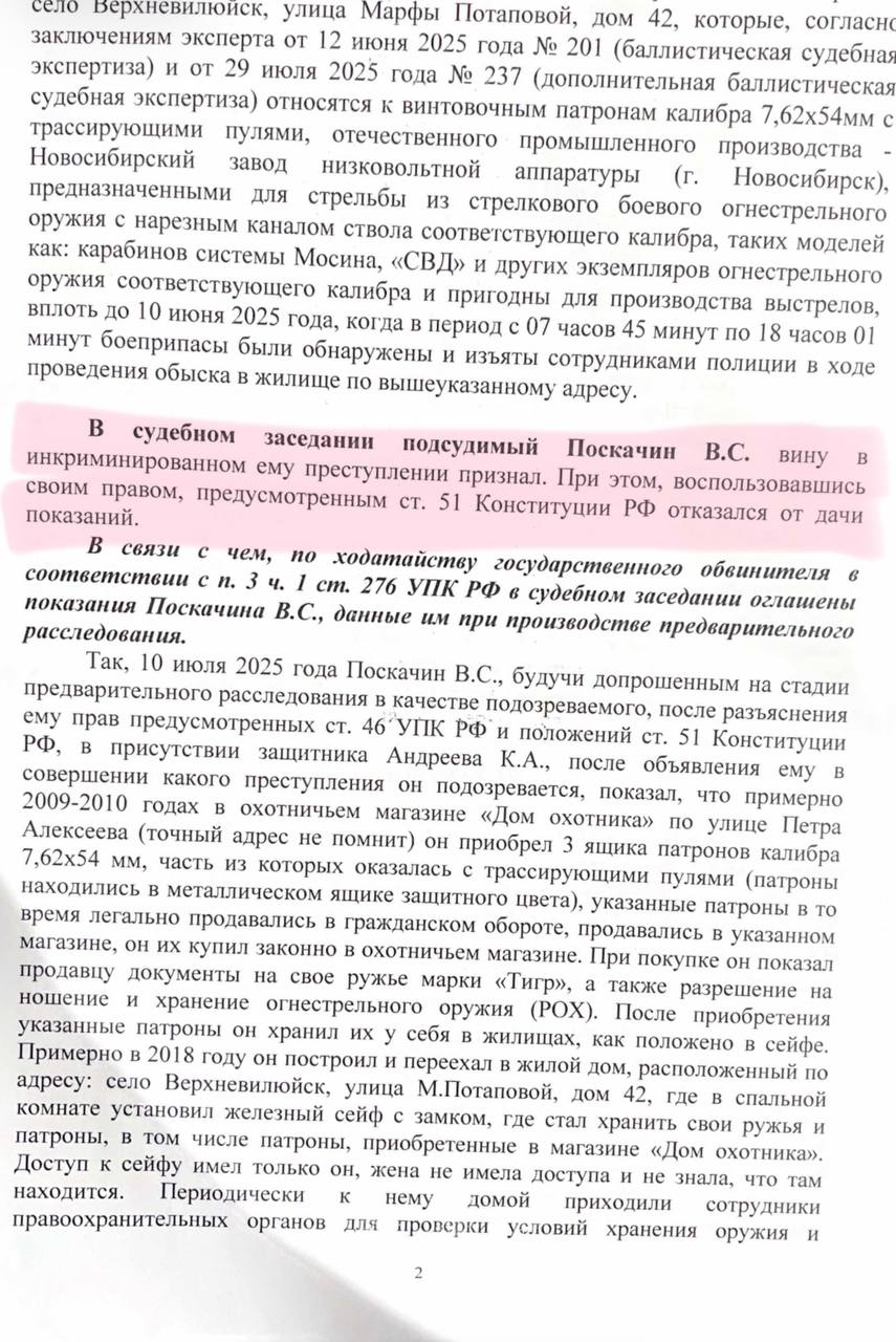 На стадии предварительного расследования Поскачин ведёт себя как человек, который надеется на мягкий исход: Признаёт вину. Даёт подробные показания: рассказывает, где купил патроны, как хранил, что знал об их характере и даже собирался сдать. Не оспаривает факт хранения, лишь пытается объяснить обстоятельства.