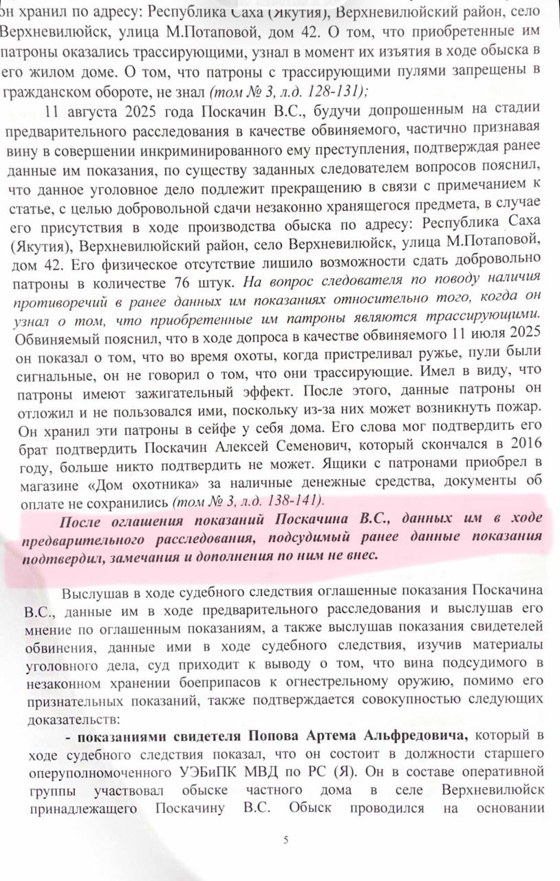 Проиграв в Верховном суде, Поскачин выходит в Telegram: Заявляет о фальсификации: «карабин не был заряжен, в протоколе обыска этого нет». Говорит о «политическом заказе» и «бездушных судьях». Утверждает, что патроны 1966 года выпуска, старые и непригодные.