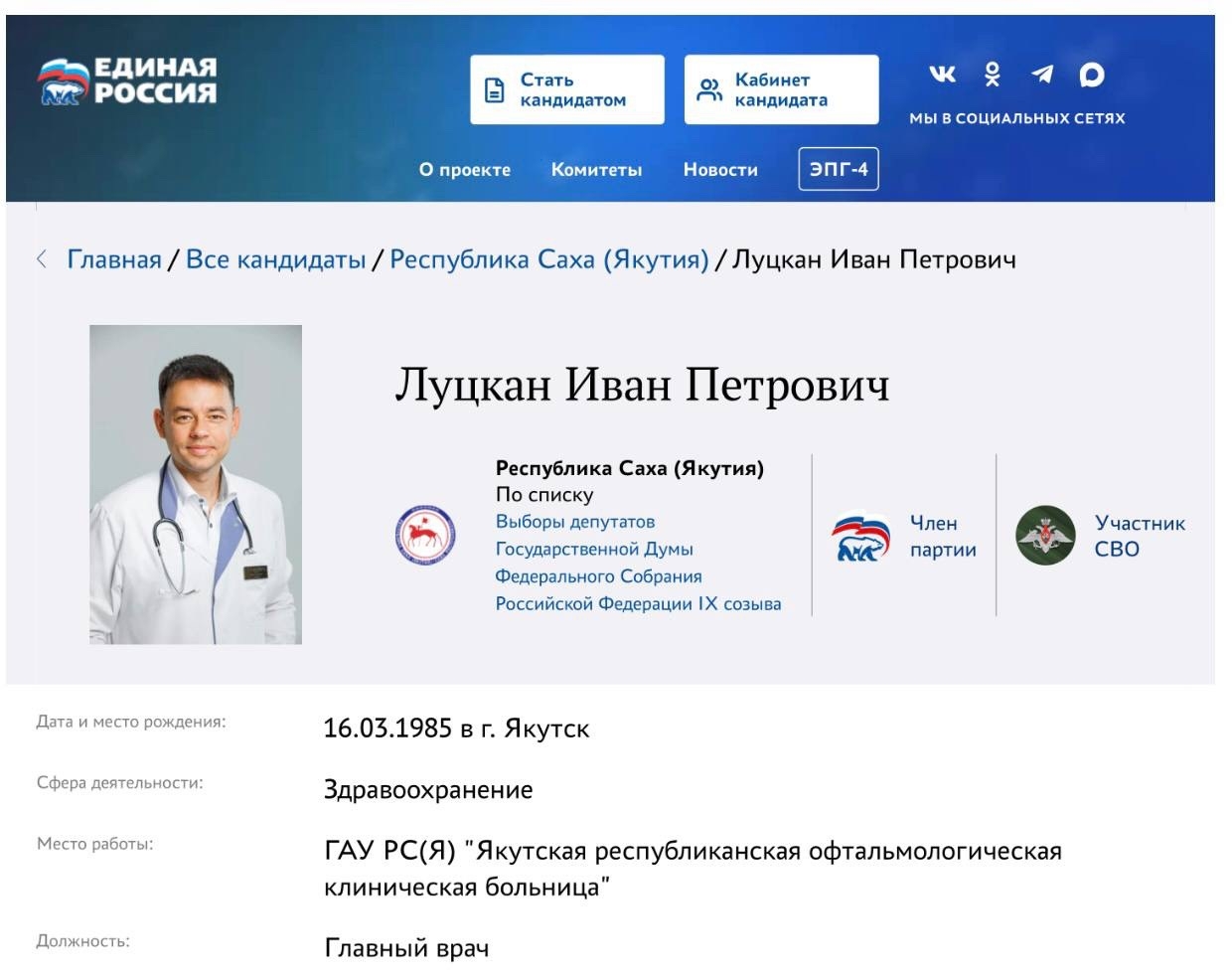 На сайте предварительного голосования партии «Единая Россия» указано, что член Президиума Регионального политического совета ЯРО Партии «Единая Россия», главный врач Якутской республиканской офтальмологической клинической больницы Луцкан Иван избирается депутатом в Госдуму в статусе участника СВО.