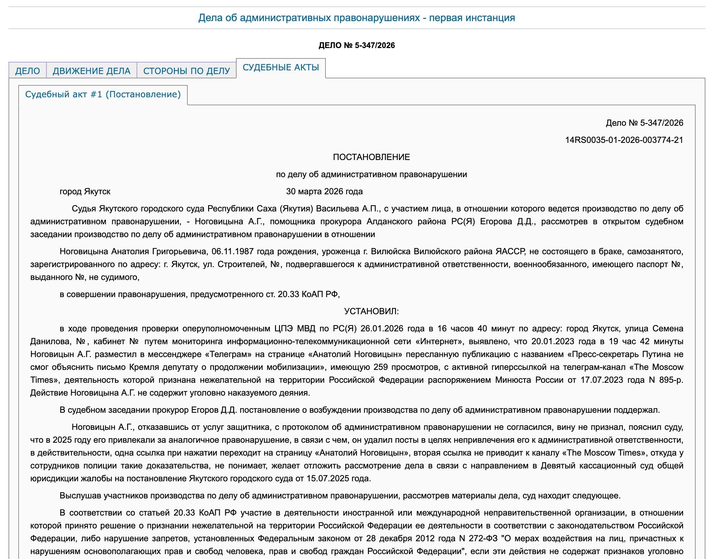 Анатолий Ноговицын, лидер якутского отделения партии «Яблоко», 30 марта 2026 года получил в Якутском горсуде штраф по статье 20.33 КоАП – за репост в Telegram от 20 января 2023 года, то есть три года назад.
