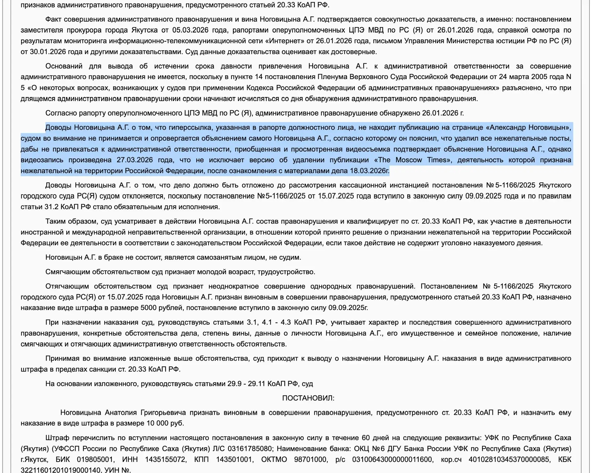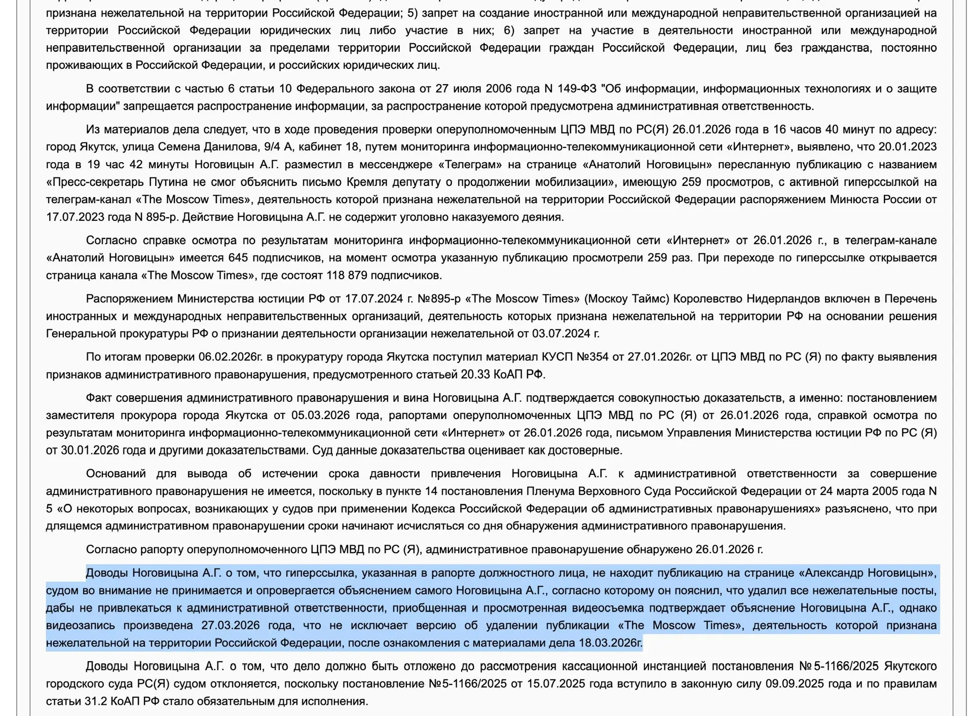 «Доводы Ноговицына А.Г. о том, что гиперссылка, указанная в рапорте должностного лица, не находит публикацию на странице "Александр Ноговицын", судом во внимание не принимается и опровергается объяснением самого Ноговицына А.Г., согласно которому он пояснил, что удалил все нежелательные посты, дабы не привлекаться к административной ответственности, приобщенная и просмотренная видеосъемка подтверждает объяснение Ноговицына А.Г. (что гиперссылка нерабочая – ТР), однако видеозапись произведена (Ноговицыным - ТР) 27.03.2026 года, что не исключает версию об удалении публикации организации, деятельность которой признана нежелательной на территории Российской Федерации, после ознакомления с материалами дела 18.03.2026г.»