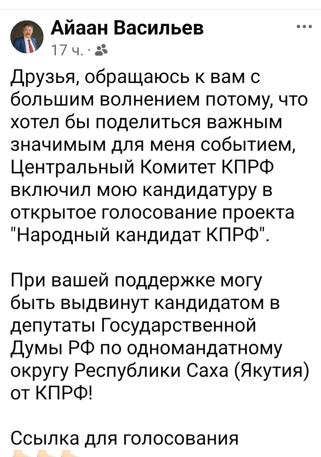 -Друзья, обращаюсь к вам с большим волнением потому, что хотел бы поделиться важным значимым для меня событием, Центральный Комитет КПРФ включил мою кандидатуру в открытое голосование проекта "Народный кандидат КПРФ".