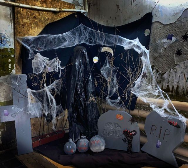 Телеграм-канал @djiikey опубликовал фото украшеного подъезда. Крест, надгробные камни и даже саму госпожу Смерть соорудили жители подъезда.